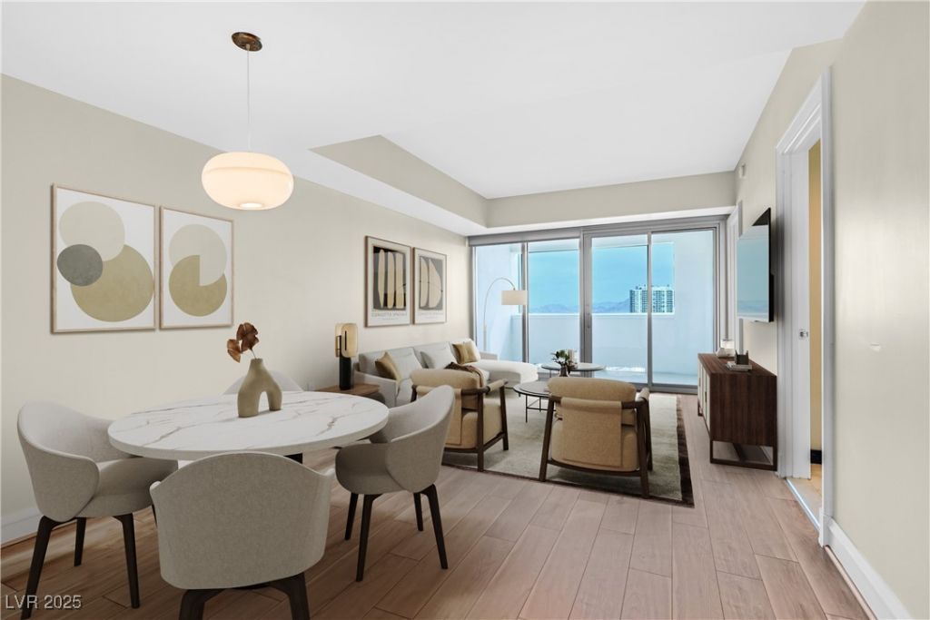 Beautiful Sky condominium unit located on the 31st floor with breathtaking views of the Las Vegas Strip. New wood flooring throughout. Large & open living room and balcony overlooking Las Vegas Blvd. & the Strip. Floor to ceiling windows. Kitchen features marble flooring, granite countertops and stainless steel appliances. Well appointed primary bathroom with marble throughout. Sky is a guard gated high rise building located at the world famous Las Vegas Strip with valet, 24-hour concierge, stunning resort pool, fitness center, media room and billiards room.